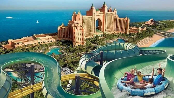 اگر به قسمت بیرونی هتل آتلانتیس که یکی از برترین هتل های دبی می باشد قدم بگذاریم می توانیم به راحتی پارک آبی آتلانتیس را مشاهده کنید. پارک آبی آتلانتیس یکی از وسیع ترین و بزرگ ترین پارک آبی دبی است.